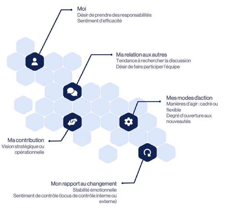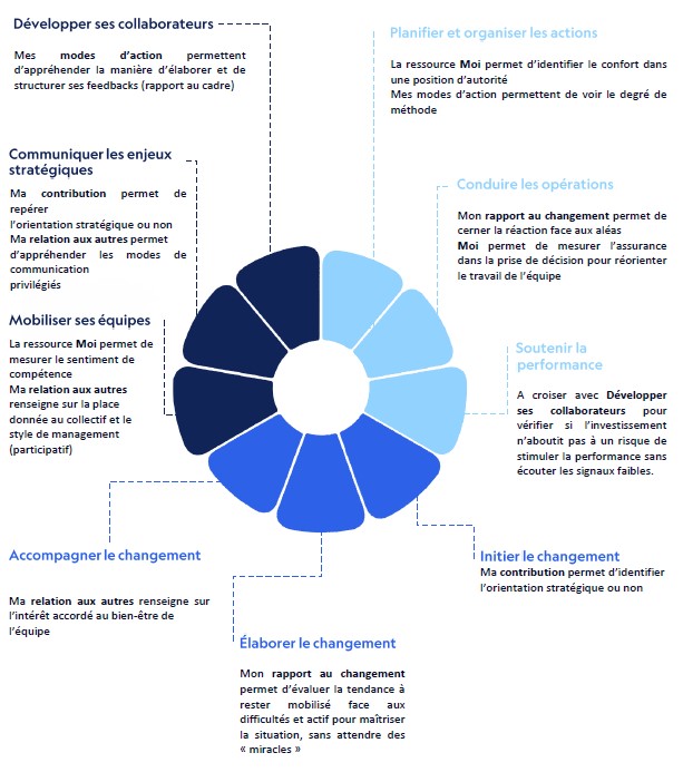 - Analyser l’image de soi et les croyances en situation de travail sur cinq ressources managériales considérées comme particulièrement importantes pour l’évaluation et le développement des compétences associées au management : influence, décision, efficacité, agilité, coopération.